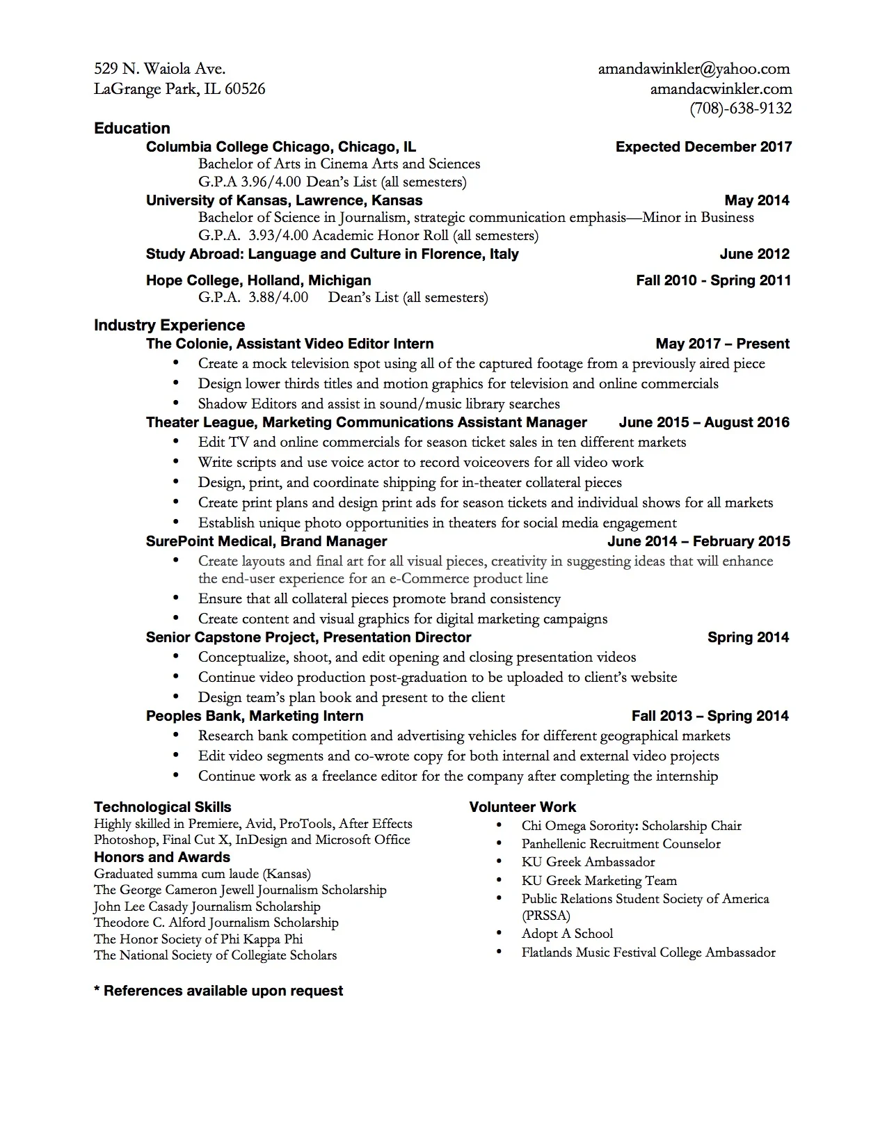 My rigorous course work combined with my professional experience make me a highly qualified candidate for any position in the post-production field. I am an extremely dedicated worker with a meticulous eye for detail in everything that I do. My work as an editor and in the marketing field has prepared me to tailor any artistic project to a variety of audiences.